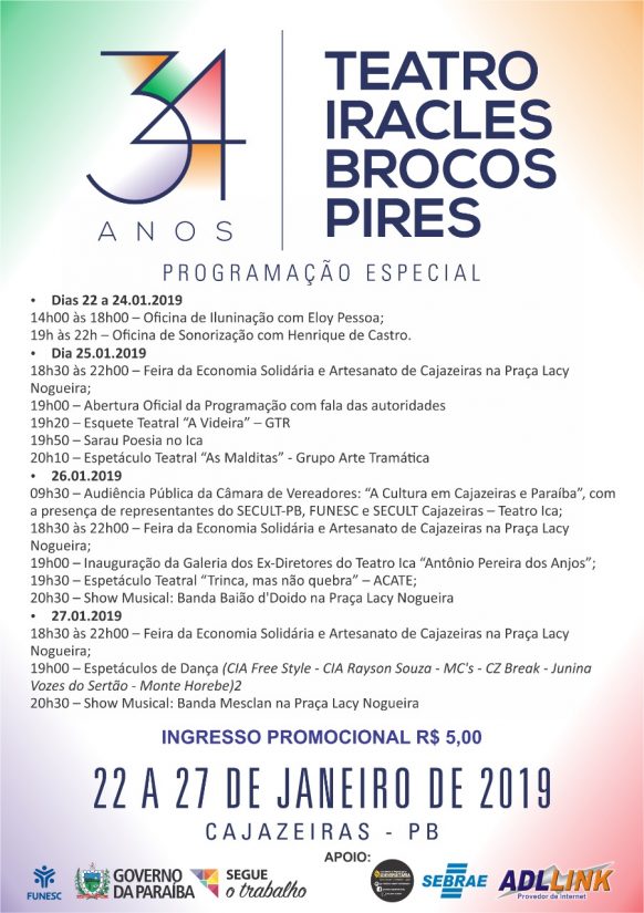 O Teatro Íracles Pires (Ica), em Cajazeiras, completará 34 anos de fundação no próximo dia 26 de janeiro. Para celebrar a data, a diretoria está organizando uma extensa programação de eventos que começa no dia 22 e se encerra no dia 27.