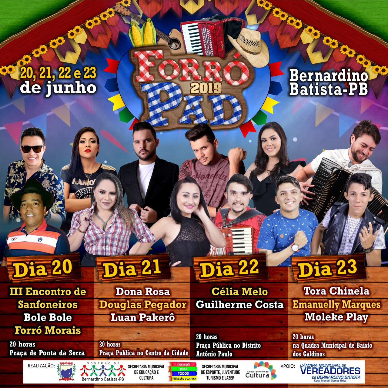 O prefeito de Bernardino Batista, Gervázio Gomes (PSB), anunciou na manhã desta segunda-feira (20) a programação do ForróPad Edição 2019. O anúncio da tradicional festa junina de Bernardino foi feito durante entrevista coletiva com a imprensa da região.