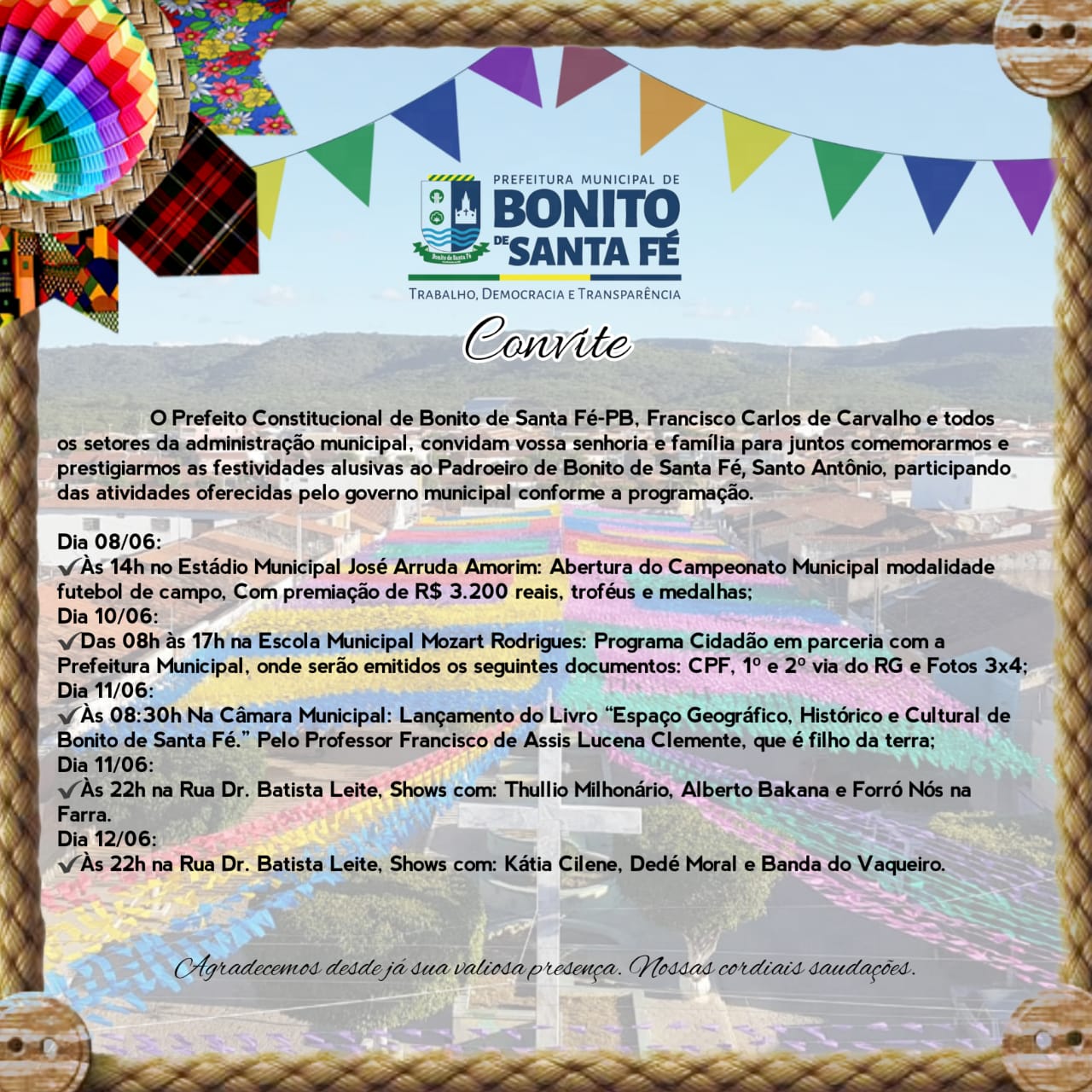 A Prefeitura de Bonito de Santa Fé vai promover quatro dias de festividades alusivas ao seu padroeiro, Santo Antônio, com ações sociais, eventos esportivos, culturais e de entretenimento.