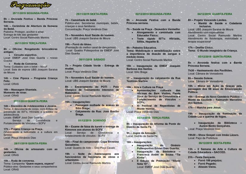 A programação vai do dia 25 deste mês até o dia 06 de dezembro com eventos sociais, esportivos, religiosos, artísticos, culturais, inauguração de obras, desfile cívico e festa com bandas ao vivo em praça pública. Neste ano um dos destaques é a 1ª edição da Marcha Para Jesus, que trará Irmão Lázaro como atração principal (confira no vídeo acima).