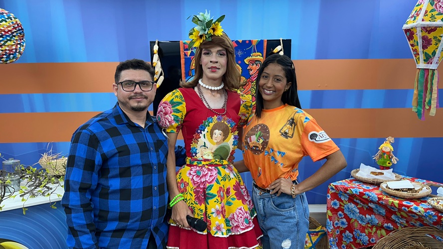Humorista Cora Pinto, Nildo Lacerda e Vitória Neves, membros da organização do festival de quadrilhas ‘Aroeira Junino’ – Foto: TV Diário do Sertão