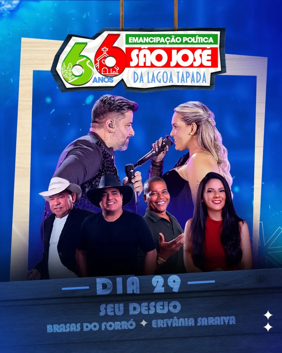 - Dia 29 de julho: Seu Desejo, Brasas do Forró e Erivânia Saraiva.