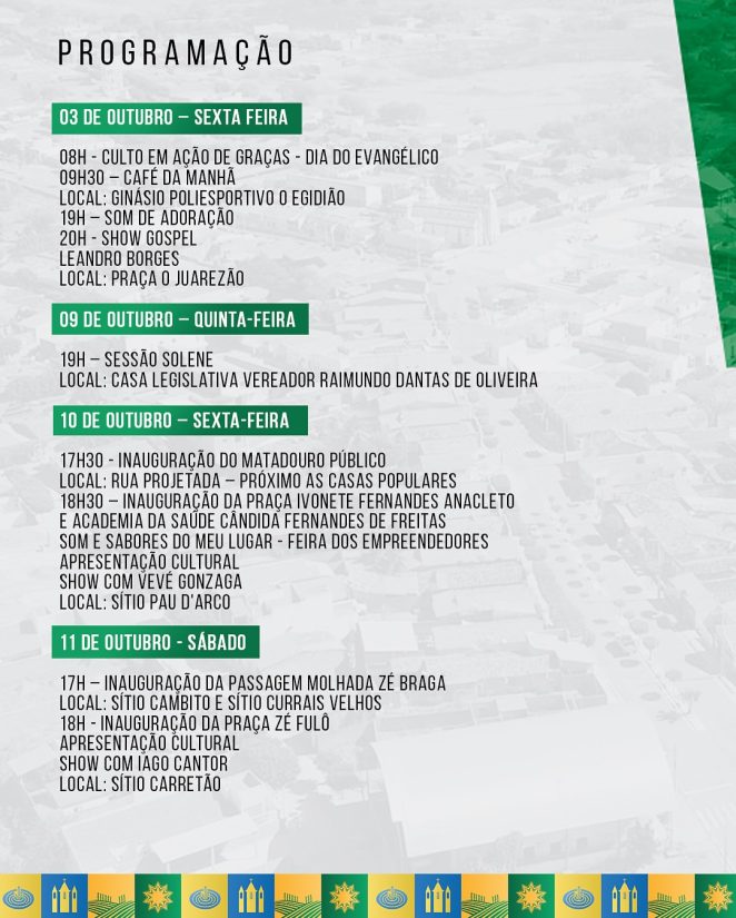 As festividades começam oficialmente nesta sexta-feira, com o Dia do Evangélico. A programação inclui culto, café da manhã, Marcha Para Jesus e será encerrada à noite com um show gratuito do cantor Leandro Borges na praça O Juarezão, a partir das 20h.
