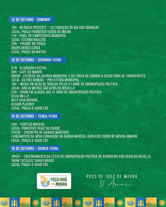 O município de Poço de José de Moura, no Sertão do estado, inicia nesta sexta-feira (3) as comemorações de seu 31º aniversário de emancipação política. No programa Olho Vivo, da Rede Diário do Sertão, a prefeita Laís Raquel (PSB) falou sobre a abertura dos festejos, que se estendem por quase 12 dias e têm como marco inicial o Dia do Evangélico.