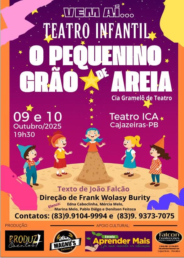 Estreia nos próximos dias 09 e 10 de outubro o espetáculo infantil “O Pequenino Grão de Areia”, no Teatro Íracles Brocos Pires, em Cajazeiras.