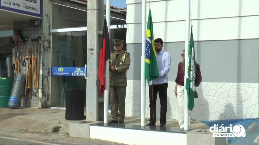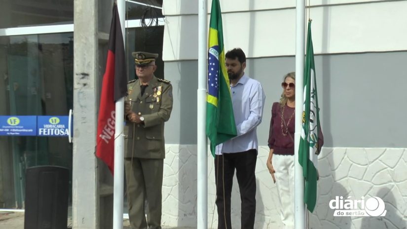 As atividades tiveram início com o hasteamento das bandeiras em frente à sede da Prefeitura Municipal.