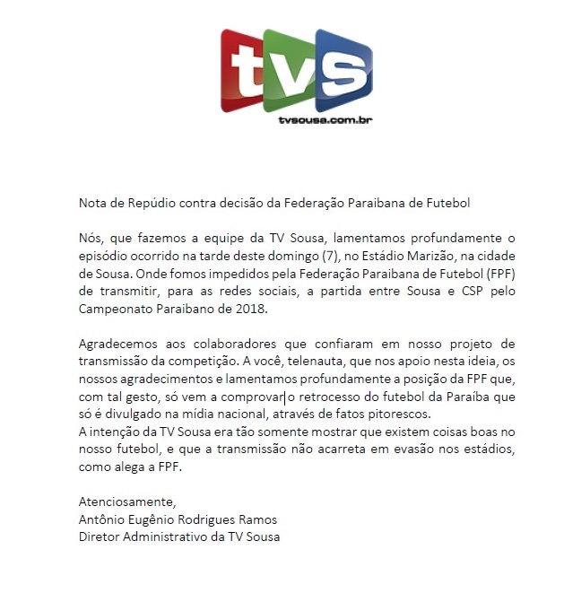 A TV Sousa, da cidade de Sousa emitiu Nota de Repúdio nesta segunda-feira (8), contra a decisão da Federação Paraibana de Futebol, que proibiu nesse domingo (7), a transmissão do jogo do Sousa e CSP, no Estádio Marizão.