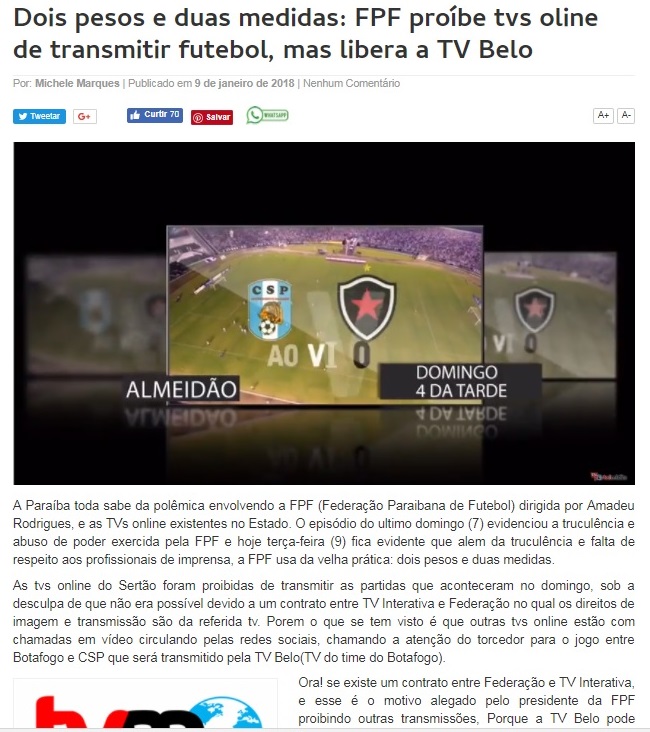 De acordo com a reportagem do Portal Mídia, enquanto a federação proíbe os veículos de comunicação do Sertão em transmitir o campeonato Paraibano 2018, libera a TV, também online, do time da capital, o Botafogo (TV Belo), para fazer a transmissão sem qualquer restrição.