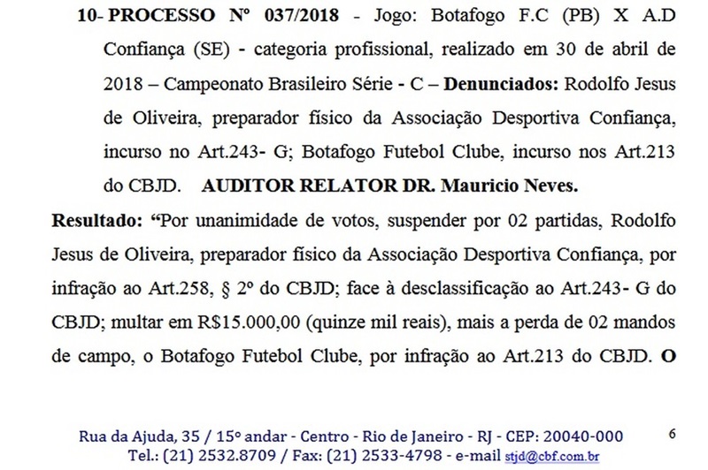 O Botafogo-PB teve uma derrota no Superior Tribunal de Justiça Desportiva (STJD). Mas não é nada relacionado à Operação Cartola. O clube foi condenado, por unanimidade, à perda de dois mandos de campo na Série C do Campeonato Brasileiro, em virtude da explosão de duas bombas no fosso do Estádio Almeidão, na vitória do Belo por 2 a 0 sobre o Confiança, pela terceira rodada da competição.