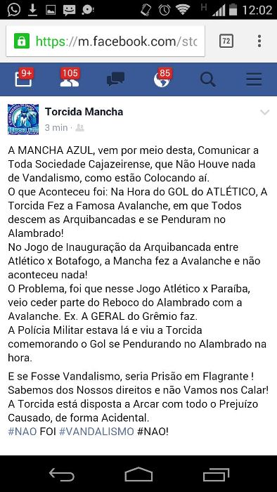 A torcida organizada Manca Azul, do Atlético de Cajazeiras, se manifestou nas redes sociais em relação aos danos materiais que o estádio Perpetão sofreu na noite da última terça-feira (2) durante o clássico Atlético e Paraíba pelo Campeonato Paraibano da Série A.