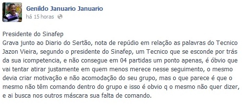 No Facebook, Genildo Januário publicou a seguinte mensagem: