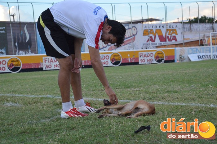 Treinador da Queimadense aproveitou para brincar com o cachorro durante o jogo (Foto: DS)