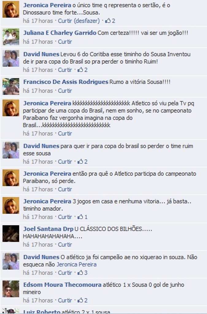 Nas redes sociais, os torcedores arriscaram os placares para o Clássico. A torcedora Jerônica Pereira afirmou que o Sousa é o único time que representa o Sertão. Veja abaixo:
