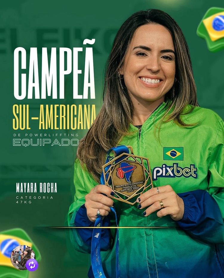 A atleta paraibana Mayara Rocha, uma das esperanças de medalha do Brasil no 39º Campeonato Sul Americano de Powerlifting Equipado, fez bonito e sagrou-se a grande campeã na modalidade de peso corporal até 47 kg, levantando 401 kg, no somatório de três movimentos. A competição ocorreu na cidade de Porto Belo-SC e foi encerrada neste sábado (27). Além da medalha de ouro, Mayara quebrou o recorde sul americano no agachamento, levantando 168,5 kg.