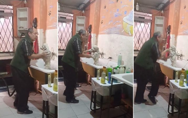 Luis Antonio Caballero tem 58 anos e não apenas penteia e dá banhos nos cachorrinhos que passam pelo seu pet shop, mas também dança com eles.
