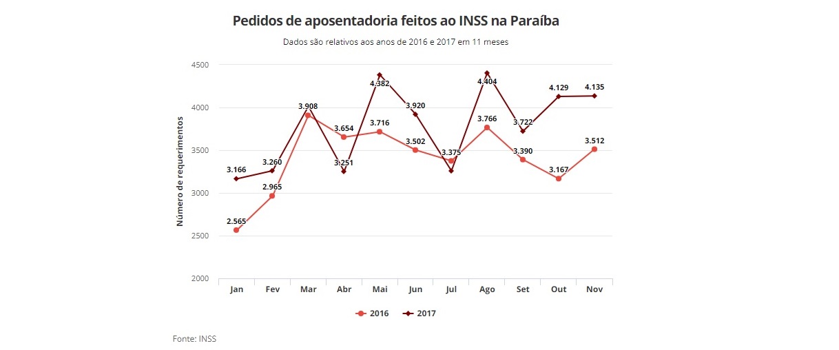 Foram 8.264 pedidos de aposentadoria em 2017 contra 6.679 nos meses de outubro e novembro de 2016. Em 11 meses, no comparativo entre os dois anos, o aumento nos requerimentos de aposentadoria ao INSS foi de 4.120, conforme dados do órgão federal na Paraíba. O aumento percentual no acumulado foi de 10,9%.