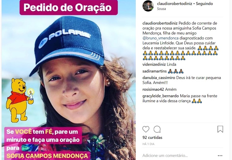 Bruno Mendonça, pai de Sofia postou mensagem no Instagram esclarecendo a doença da filha: “A batalha será grande, porém, a vitória está garantida”, disse. A família mora em João Pessoa na Paraíba.