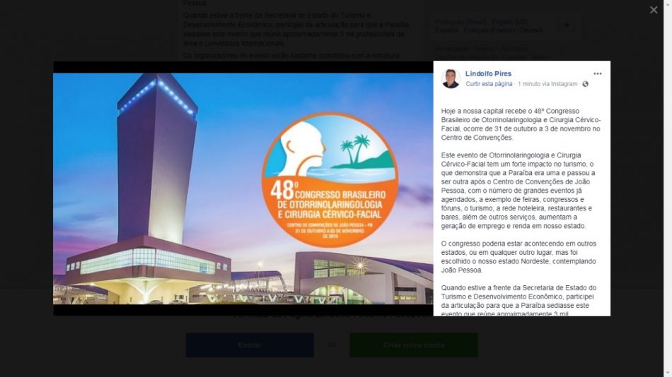 O deputado do deputado estadual, Lindolfo Pires (PODEMOS) utilizou das redes sócias para destacar a realização do 48º Congresso Brasileiro de Otorrinolaringologia e Cirurgia Cérvico-Facial, o evento que tem início nesta quarta-feira (31) e vai até o próximo dia 03 de novembro no Centro de Convenções de João Pessoa.