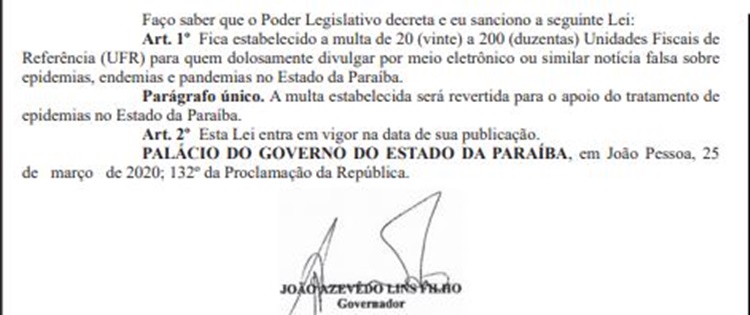 O governador João Azevêdo (Cidadania) sancionou a lei 11.659/20, de autoria do deputado estadual Wilson Filho (PTB), que estabelece multa de R$ 1 mil a R$ 10 mil para quem disseminar ‘fake news’ sobre endemias, epidemias e pandemias na Paraíba.