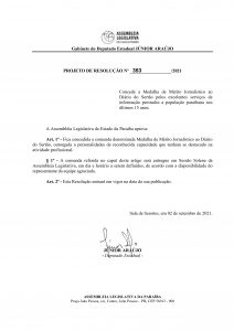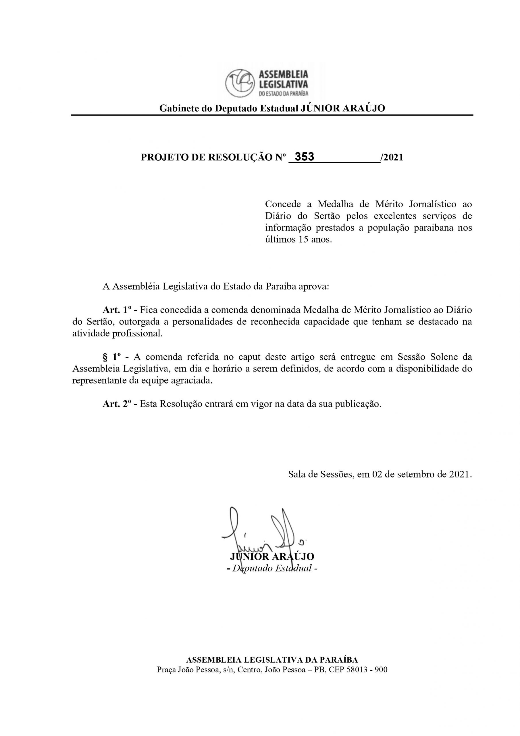 O Projeto de Resolução Nº 353/2021 destaca que “fica concedida a comenda denominada Medalha de Mérito Jornalístico ao Diário do Sertão, outorgada a personalidades de reconhecida capacidade que tenham se destacado na atividade profissional”.