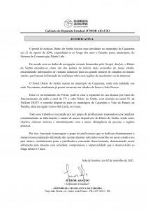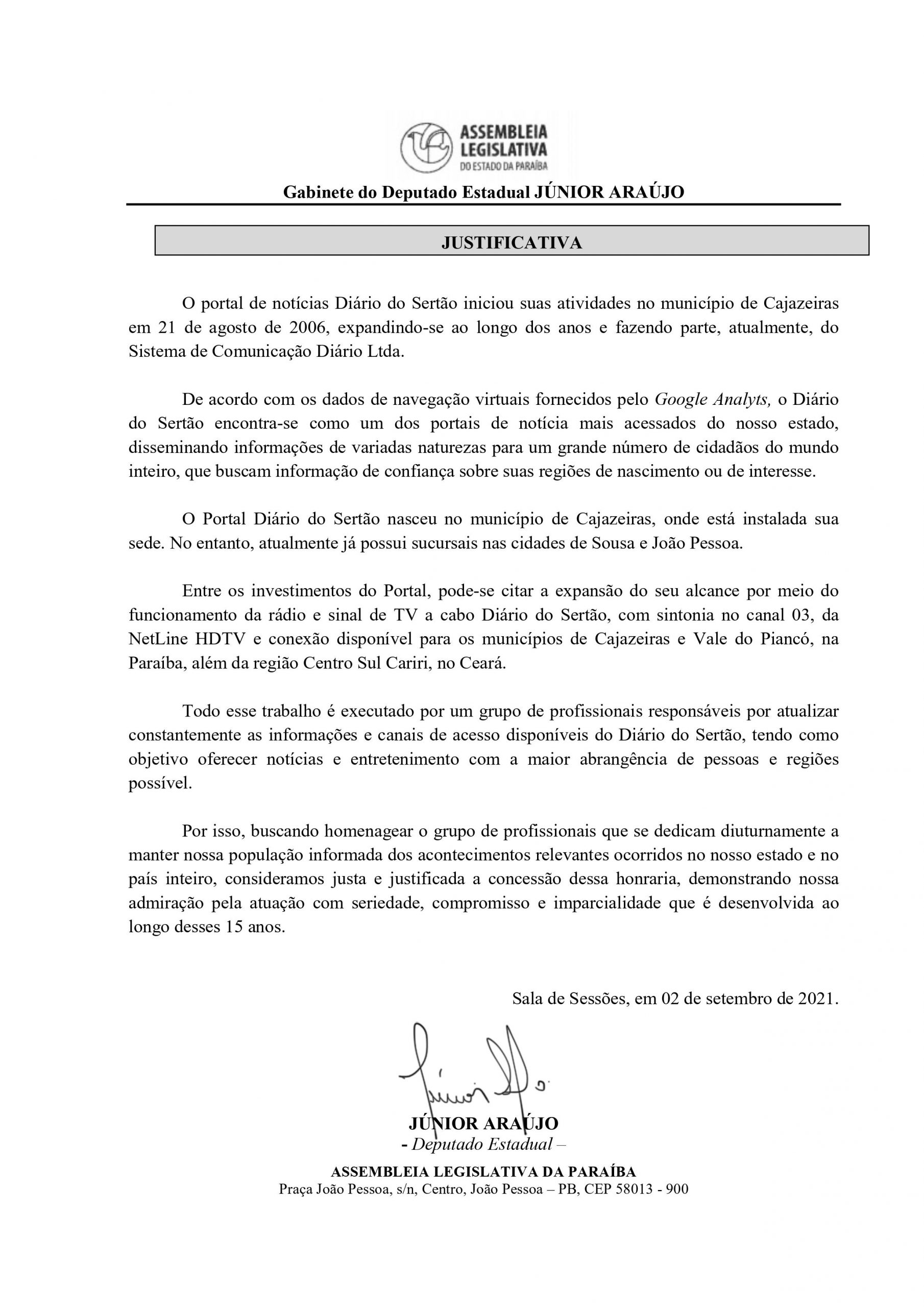 “O pioneirismo do Portal Diário do Sertão é reconhecido por toda a imprensa paraibana, e eu entendi que esta ocasião de aniversário de 15 anos de fundação celebrados em 2021 é propícia para esta homenagem justa. O Sistema Diário do Sertão, que contém portal, TV e rádio, é uma das empresas de comunicação que mais crescem nesta região do Nordeste e nos orgulha ressaltar que sua origem e base estão em Cajazeiras”, disse o deputado.