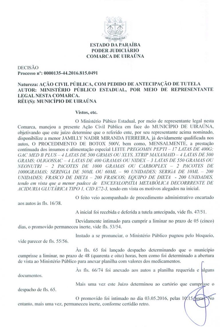 O Juiz da Comarca de Uiraúna, Fabiano L. Graça Costa determinou nessa quinta-feira (05), que a prefeitura forneça a medicação necessária para a Jamilly Nadir, de 3 anos. A decisão atende a solicitação do Ministério Público da cidade.