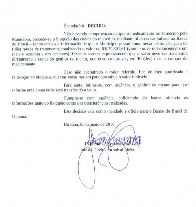 Na decisão, Fábio Costa determinou que o município repasse o valor de R$ 29.801, 61 para uma conta bancária da família da criança, para a compra da medicação referente a 3 meses, além de determinar que mensalmente, a prefeitura forneça o valor referente a compra da medicação de Jamilly.