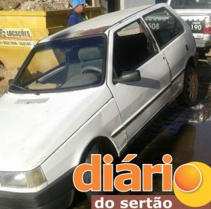 Um carro, Fiat Uno de cor branca caiu em buraco na Rua Epifânio Sobreira, no Centro de Cajazeiras.