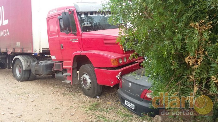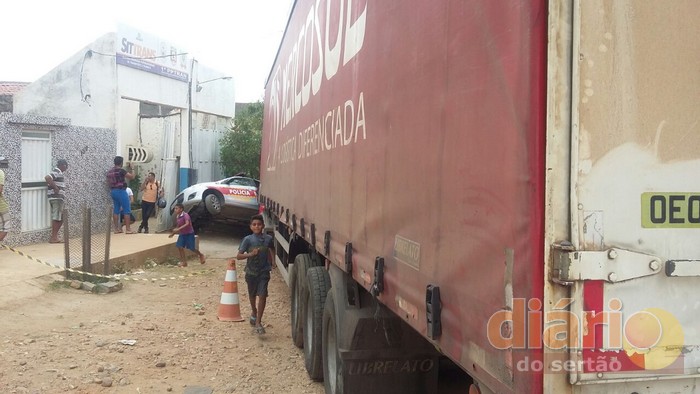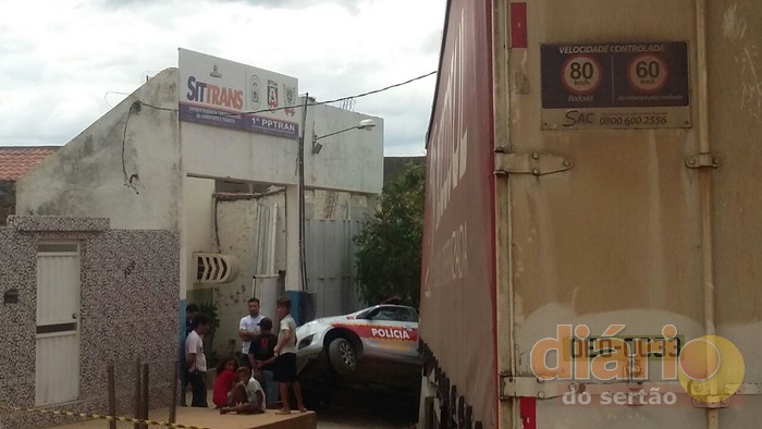 Um caminhão de cor vermelha desgovernado bateu em uma viatura da Polícia Militar, e mais um veículo pertencente a um agente de trânsito do muncípio.