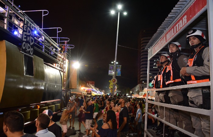 O policiamento, distribuído desde a concentração até a dispersão dos foliões, atuou não apenas no corredor da folia, mas também nas adjacências da festa assegurando a chegada e saída dos foliões ao bloco. De maneira preventiva e ostensiva, a PM esteve presente com motocicletas, viaturas, policiamento a cavalo, segways e patrulhas a pé.