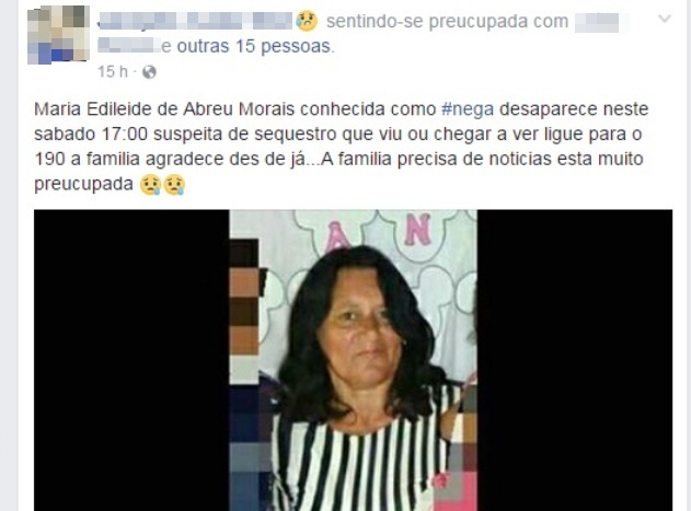 A família de Maria Edileide de Abreu Morais, moradora do Sítio Contas, município de Cajazeiras fez um apelo pelas redes sociais para tentar encontrá-la. A comunidade fica próxima ao Distrito de Boqueirão.