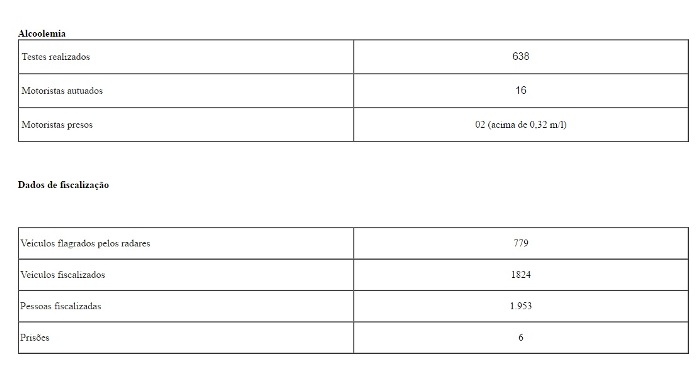 * Todas as vítimas fatais estão relacionadas à acidentes envolvendo motocicletas. Duas ocorrências aconteceram no interior do Estado; um deles foi um atropelamento de animal e o outro uma colisão na traseira de um caminhão por não guardar distância de segurança. O terceiro acidente ocorreu na Região Metropolitana de João Pessoa. O condutor, um homem de 29 anos de idade, perdeu o controle da moto e caiu juntamente com o passageiro. Ambos foram atropelados, após a queda, por uma outra motocicleta que seguia atrás com três ocupantes. O condutor da primeira morreu.