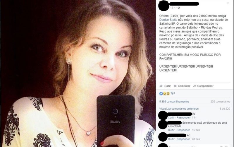 Denise desapareceu na noite de segunda-feira (24) e seu carro foi encontrado abandonado em um canavial da cidade. De acordo com a investigação, a designer foi jantar na casa de uma amiga e depois foi encontrar o amante. Grávida de dois meses, Denise teria recusado o pedido do amante para fazer o aborto e por isso foi enforcada com o cinto de segurança do carro.
