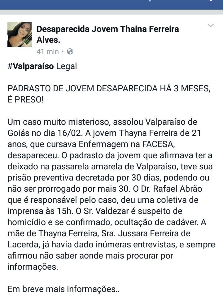 Três meses após o desaparecimento da universitária de enfermagem, Thayná Ferreira Alves, 21 anos, a Polícia Civil de Goiás prendeu nesta quinta-feira (25) o padrasto da jovem. Ele afirma ter deixado a estudante em um ponto de ônibus da BR-040, em Valparaíso, no Estado de Goiás, no dia 16 de fevereiro deste ano.