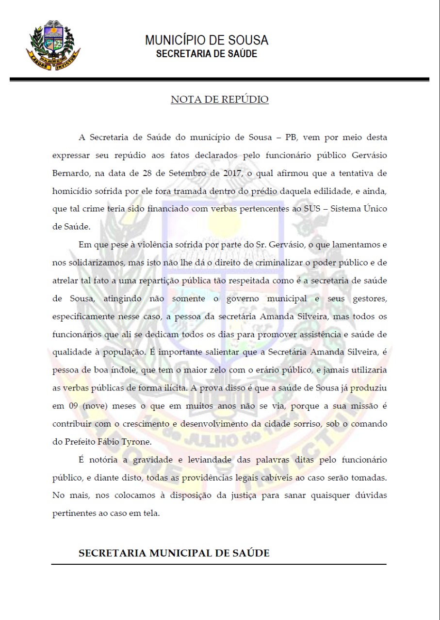 Nota da Secretaria de Saúde: A Secretaria de Saúde do município de Sousa divulgou uma nota de repúdio contra Gervásio. No documento, está escrito que a secretaria vai tomar as providências legais cabíveis sobre o caso.