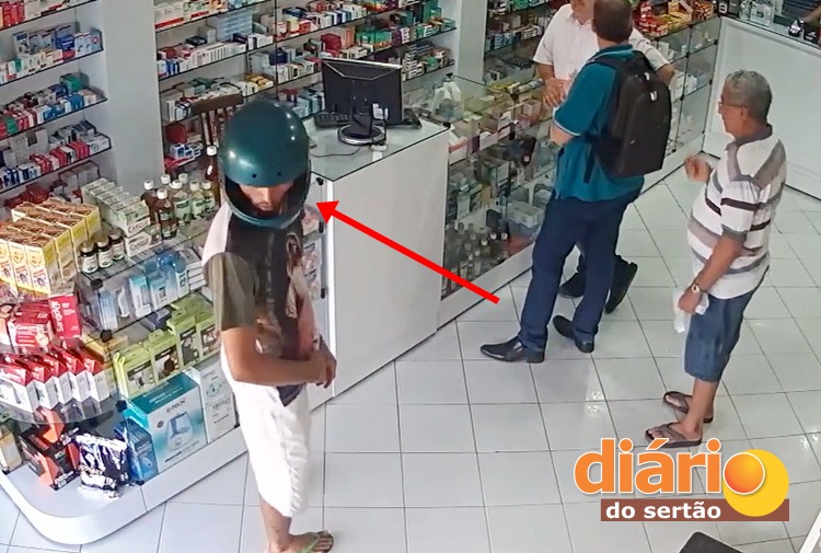 Por volta das 17:20h, o ladrão roubo uma farmácia que fica localizada na Rua José Fagundes de Lira, bairro Gato Preto na cidade de Sousa. Ele chegou em sua moto de cor vermelha e sozinho praticou o crime.