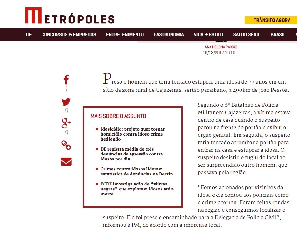 A prisão de um homem suspeito de tentar estuprar uma idosa de 77 anos de idade, moradora do Sítio Catolé, Zona Rural de Cajazeiras, Sertão da Paraíba foi destaque na mídia nacional.