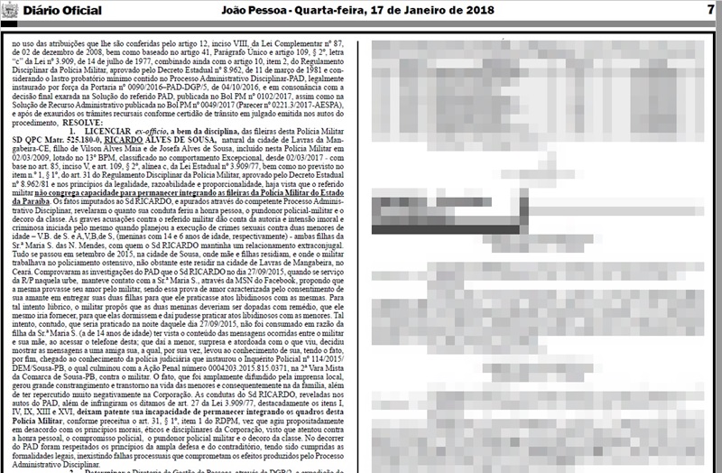O Comandante-Geral da Polícia Militar do Estado da Paraíba divulgou nesta quarta-feira (17), o licenciamento do policial Ricardo Alves de Sousa, natural da cidade de Lavras da Mangabeira, Estado do Ceará, lotado no 13º BPM da cidade Itaporanga, Sertão da Paraíba. A portaria de ‘afastamento’ do policial foi divulgada no Diário Oficial do Estado da Paraíba. “O referido militar não congrega capacidade para permanecer integrando as fileiras da Polícia Militar do Estado da Paraíba”.