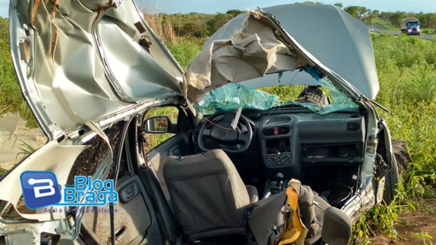 O carro ficou completamente destruído após bater em uma árvore quando o motorista tentou ultrapassagem na rodovia federal.