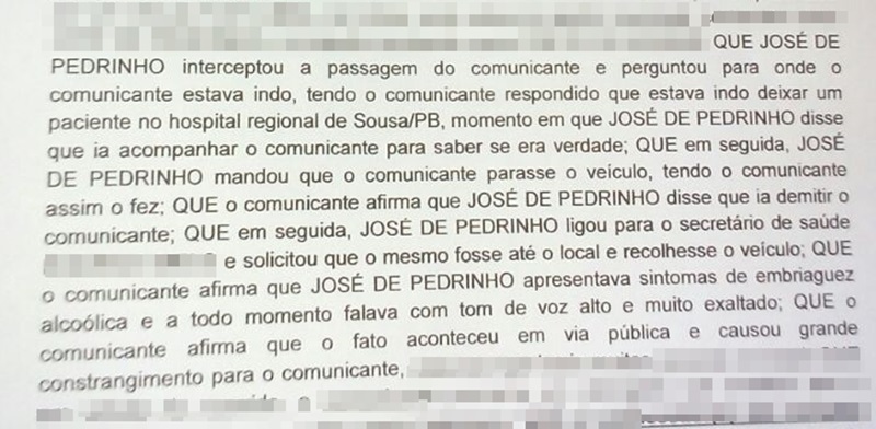De acordo com o funcionário, quando passava pela Rua Camilo Gomes de Farias, centro da cidade foi interceptado por um veículo, onde estavam, o gestor público e um popular. Segundo o servidor, Zé Pedrinho mandou que ele parasse o carro, onde estava o paciente e o ameaçou de demissão.