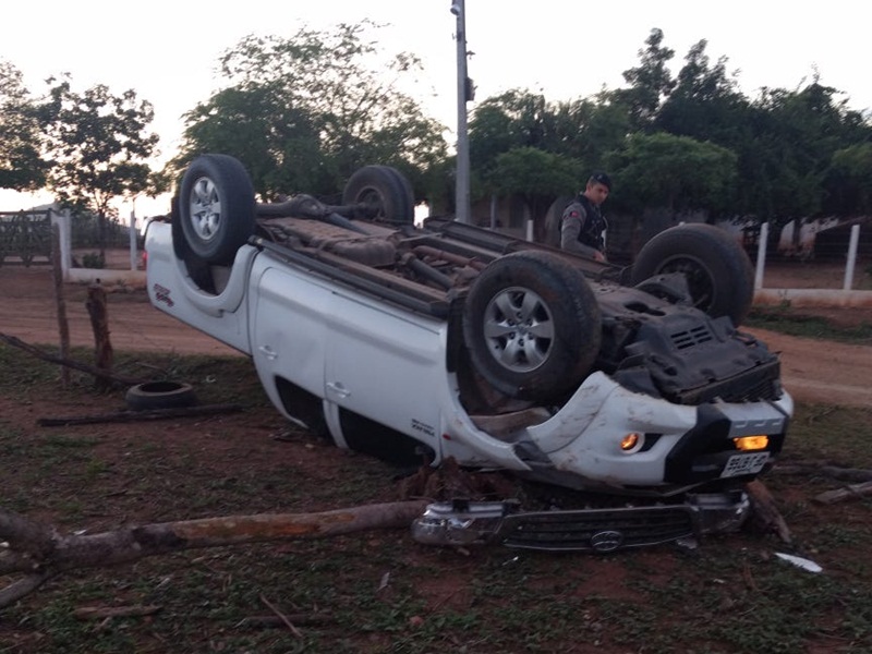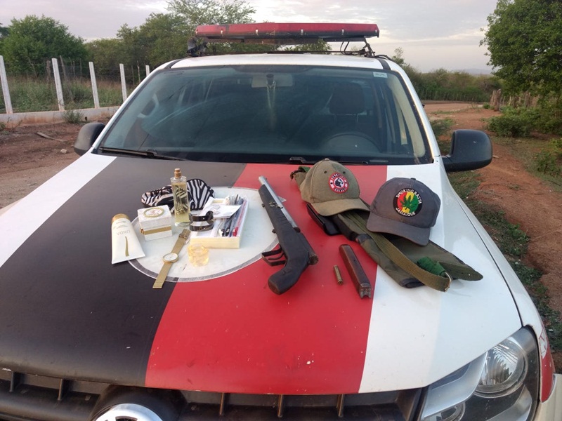 Durante as buscas, o veículo foi encontrado capotado, e no seu interior foi encontrado alguns dos objetos roubados e uma arma de fogo de fabricação caseira cal 12.