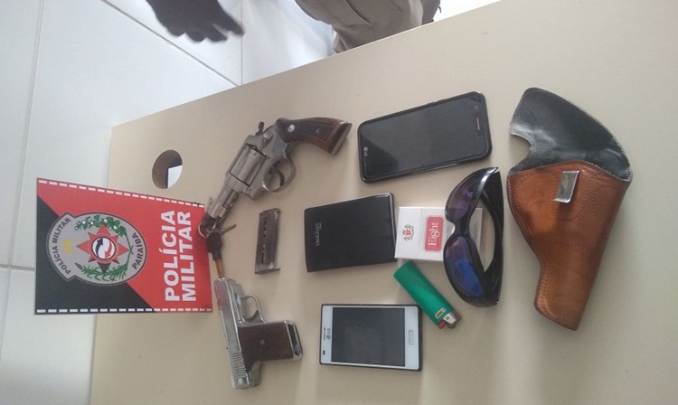 Por volta das 09 horas desta segunda-feira (26), policiais militares da Patrulha Rural realizavam diligências na Zona Rural de Cajazeiras com objetivo de localizar dois homens que haviam assaltado logo pela manha um restaurante localizado na comunidade Jardineira quando localizaram nas proximidades do Sítio Boa Vista, dois homens em uma motocicleta, sendo abordados e com eles apreendido duas armas de fogo, sendo um revólver Cal 38 e uma Pistola Cal 32.