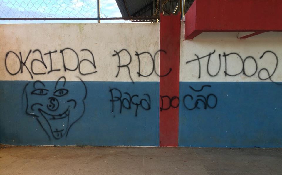 Na escola eles escreveram os dizeres “Okaida RDC Tudo 2 Raça do Cão” e desenharam o suposto rosto de um palhaço (no mundo do crime, diz-se que tatuagem de palhaço identifica criminoso que executa policiais).