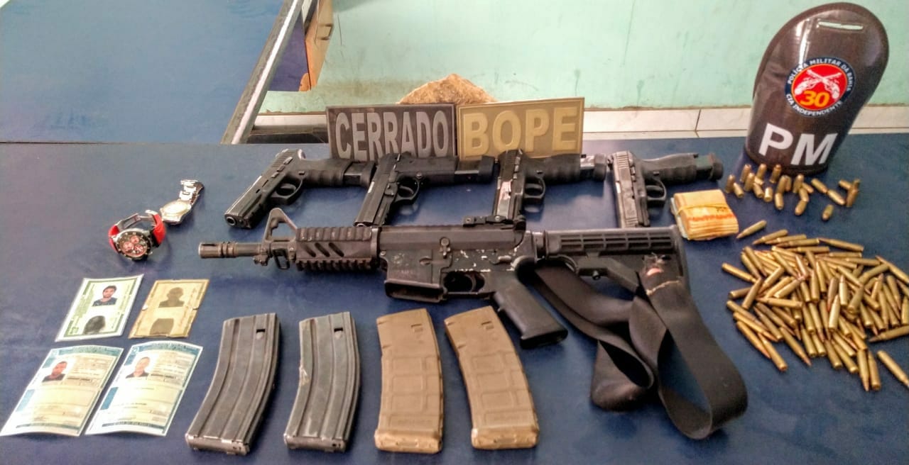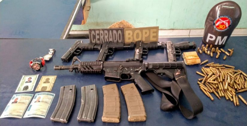 1 (um) fuzil, calibre 5,56, marca Colt, com 04 (quatro) carregadores e 104 munições; 01 (uma) PT 940, calibre .40, marca Taurus, com 01 (um) carregador contendo 08 (oito) munições; 02 (duas) PT 24/7 PRO, calibre .40, marca Taurus, com numeração suprimida, cada uma com 01 (um) carregador contendo 07 (sete) munições; 01 (uma) PT 840, calibre .40, marca Taurus, com ferrolho modificado e numeração suprimida, com 01 (um) carregador e 05 (munições); 22 munições sobressalentes calibre .40; R$ 1.553,25 (um mil quinhentos e cinquenta e três reais e vinte e cinco centavos) em cédulas e moedas e 02 (dois) relógios.