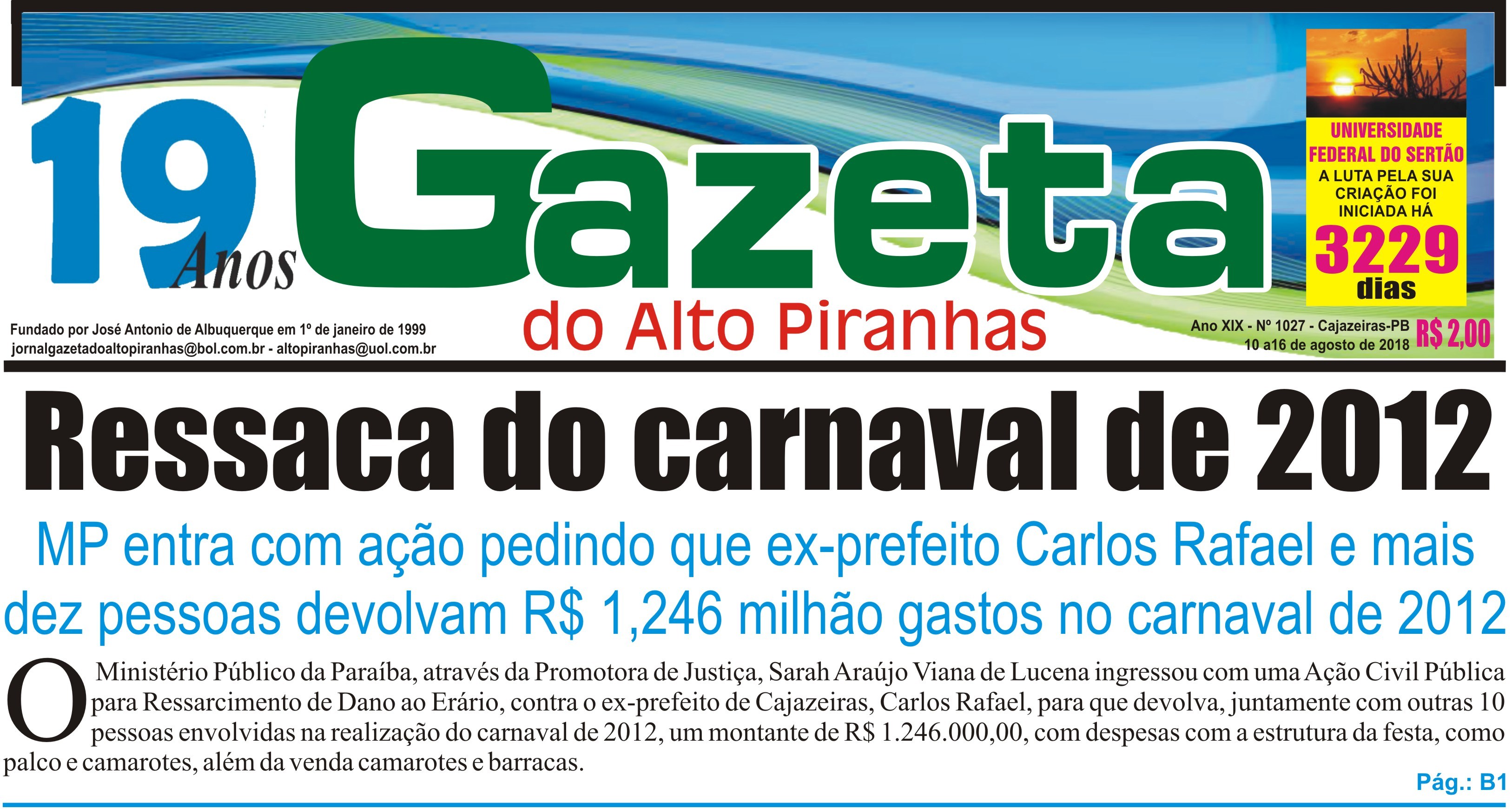O jornal Gazeta do Alto Piranhas desta semana deu destaque na sua capa a uma matéria a respeito de uma Ação Civil Pública ajuizada pelo Ministério Público da Paraíba, através da promotora Sarah Araújo Viana de Lucena, para que o ex-prefeito de Cajazeiras, Carlos Rafael Medeiros, e outras dez pessoas devolvam R$ 1.246.000,00 aos cofres da Prefeitura. O motivo, de acordo com a denúncia, são supostas irregularidades na aplicação da verba para a realização do Carnaval 2012.