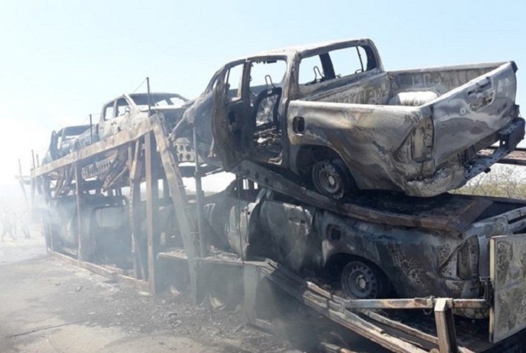 Sete caminhonetes Hilux que estavam sendo transportadas por um caminhão-cegonha pegaram fogo nesta quarta-feira (22), na rodovia BR-405, trecho que liga as cidades de São João do Rio do Peixe e Uiraúna, no Alto Sertão do estado.