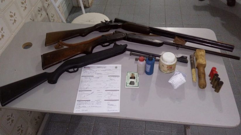Segundo a PM, o suspeito tentou fugar novamente a pé sendo alcançado por essa guarnição, foi feito averiguação na casa do acusado sendo localizada outra espingarda cal 28, material para recarga de munição e uma espingarda de pressão.