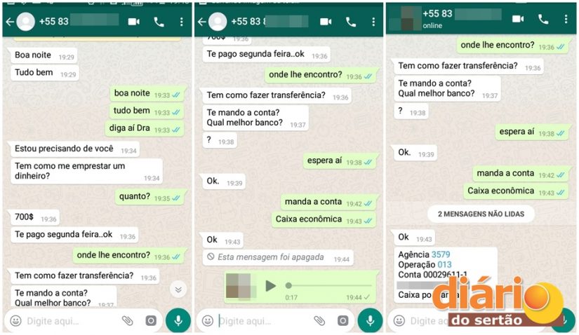Na noite de terça-feira (18), uma mulher da cidade do Lastro, região de Sousa, no Sertão do estado, teve o seu aplicativo de mensagens clonado. Vários contatos da vítima foram surpreendidos com mensagens de bandidos que se passavam por ela, pedindo uma quantia em dinheiro emprestada e que depositassem em uma conta bancária.