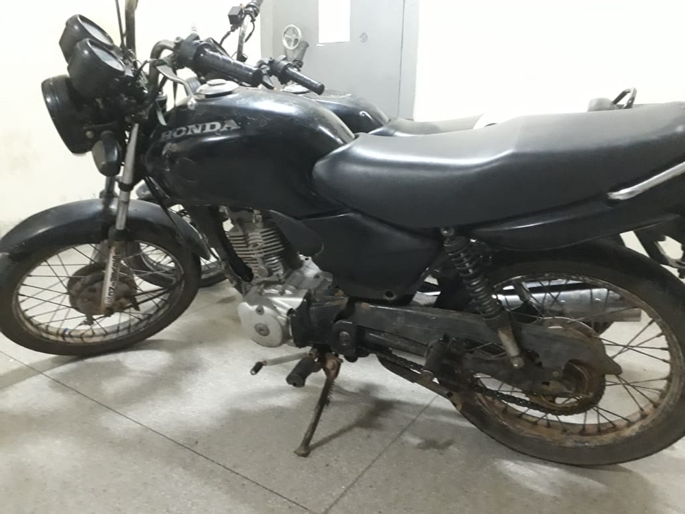 Já o segundo veículo foi recuperado por volta das 19h30min, no centro da cidade quando a guarnição policial suspeitou de uma Honda Titan 125, de cor preta que estava sem placa e conduzida por um homem de 24 anos de idade, que já responde por roubo de veiculo, momento em que foi feito uma abordagem e constatado que a motocicleta estava com a numeração do chassi e do motor picotada, sendo impossível fazer uma consulta a não ser através de exames periciais.