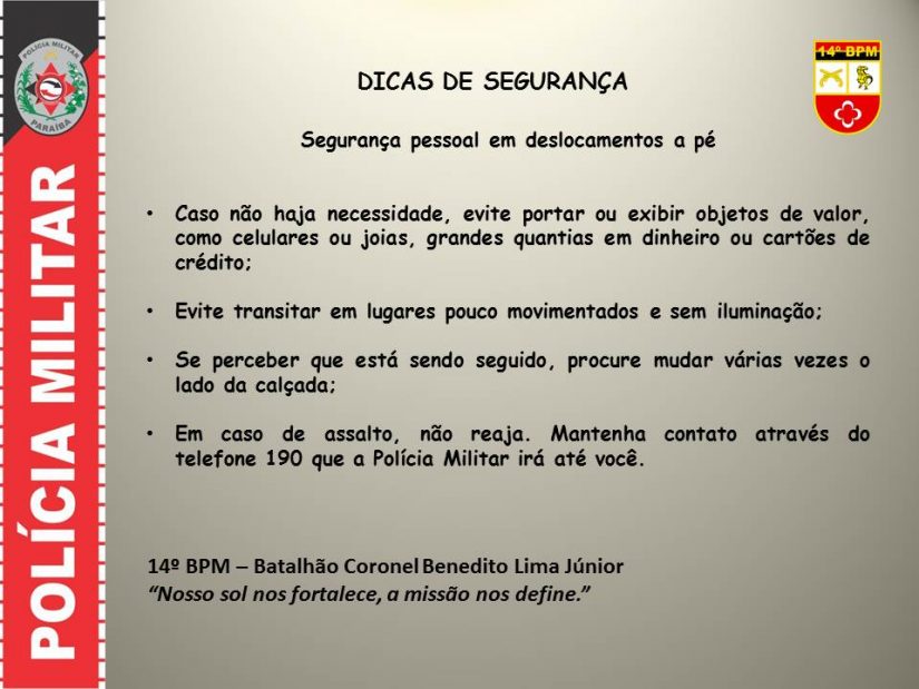 O 14º Batalhão de Polícia Militar da cidade de Sousa, Sertão do estado, deu algumas dicas de prevenção e segurança para quem anda a pé, evitar roubos e assaltos.
